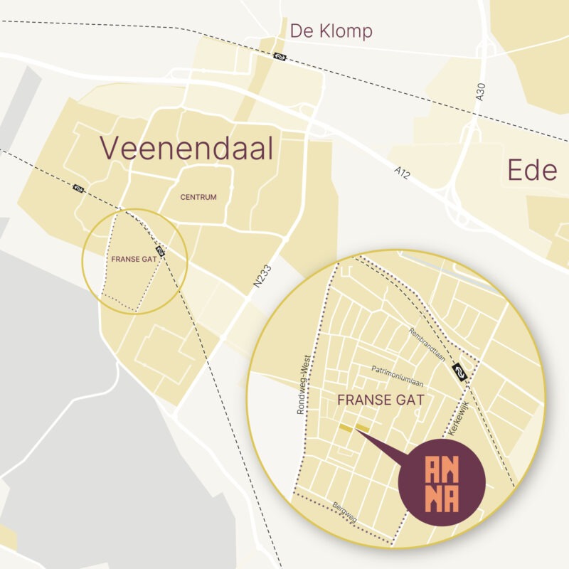 Locatie is alles, en Anna ligt overal dichtbij. Station Veenendaal-Centrum ligt bijvoorbeeld op zo’n 5 minuten fietsen. Of je nu nar Utrecht of Rhenen moet, je bent er zo. Moet je verder het land in? In een kwartier fiets je naar Station de Klomp waar regelmatig Intercity’s naar Amsterdam, Nijmegen, Utrecht of Arnhem rijden. En via de A12, A30 en A15 ben je zo de regio in.